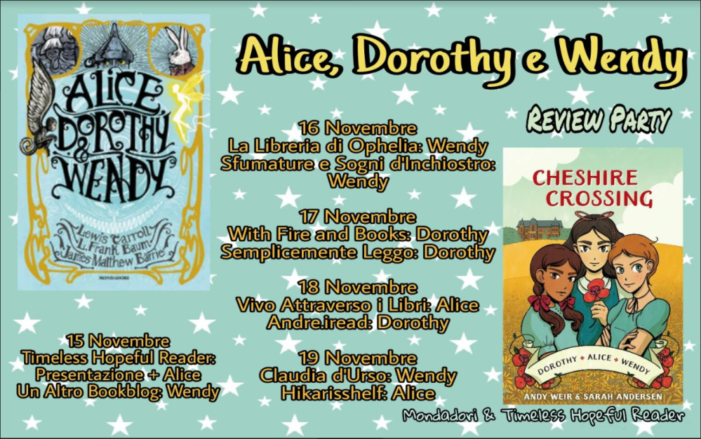 Come ho detto nell’articolo di questa mattina, dedicato al Drago “Alice Dorothy e Wendy”, oggi parliamo del Graphic Novel dedicato a questi personaggi: “Cheshire Crossing“. Il Review Party è sempre organizzato da Milena di @Timelesshopefulreader che ringrazio.